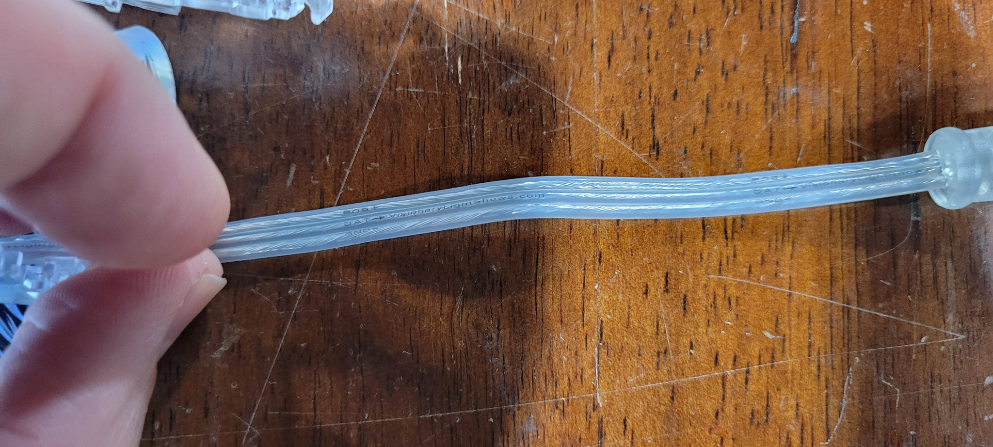- Wire specs: 0.32mm2 wires cooper, 18 awg. Clear wire that is labeled as positive (POS+), negative (GND-) and data and the direction of the data (DAT->)